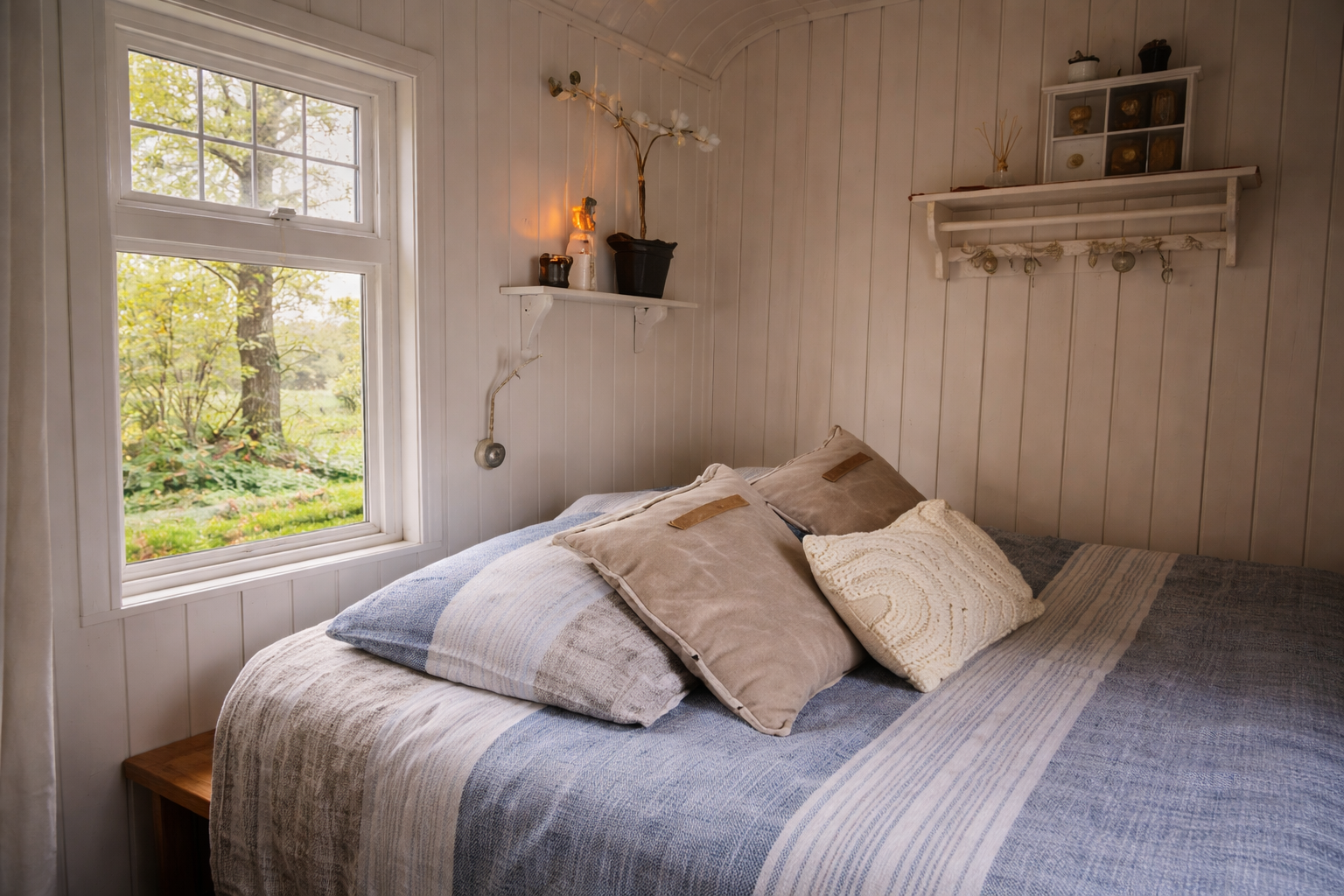 Achterin bevindt zich de slaapkamer. Compact en sfeervol, en het bed is al comfortabel voor jullie opgemaakt.
