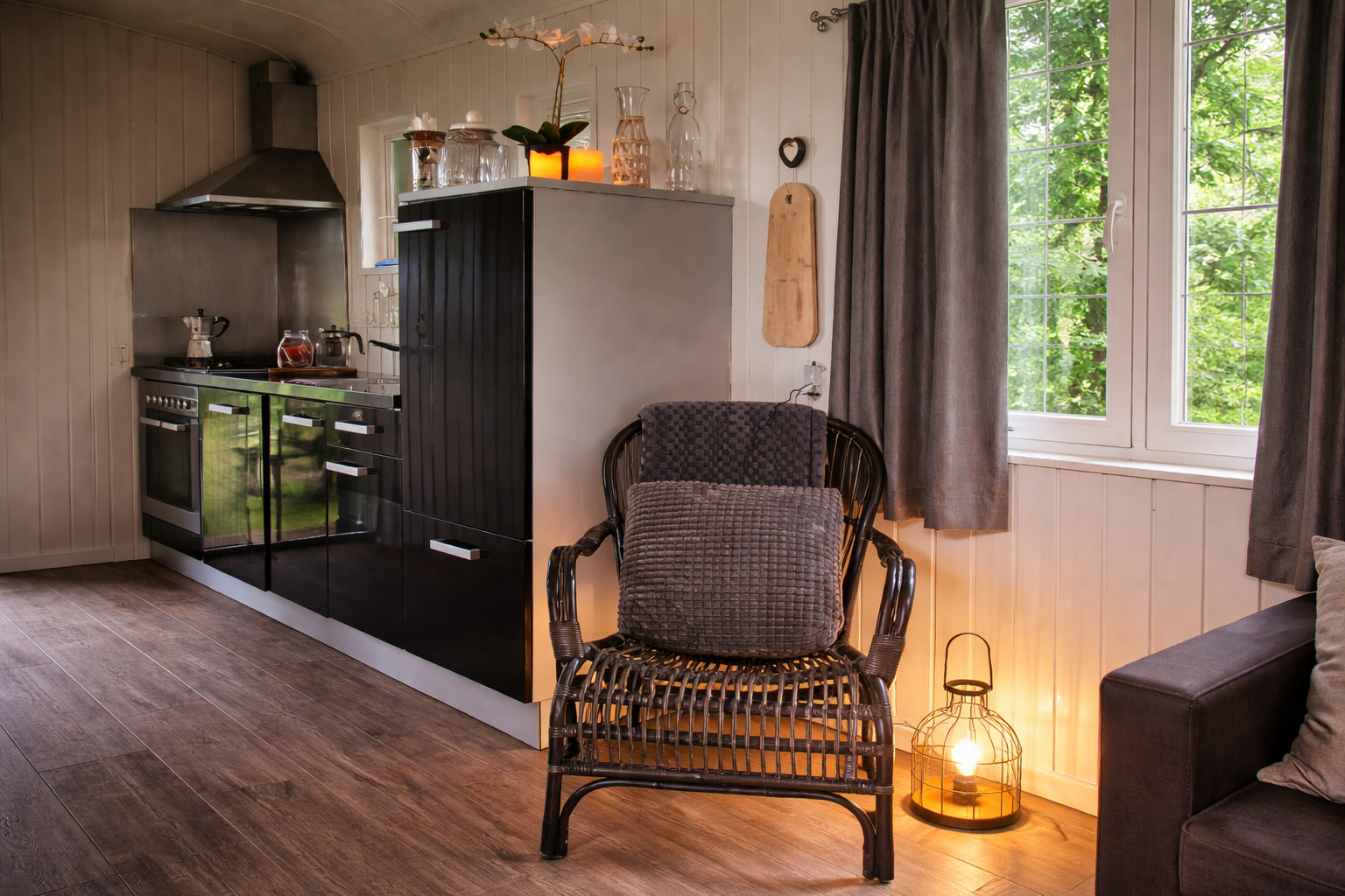 Je komt deze sfeervolle woonwagen binnen via een trapje en nog een oude originele authentieke deur . Je staat direct in een keuken die werkelijk alles heeft: van gasfornuis en oven ,koelkast , waterkoker, Bialetti tot een met vaatwasser.