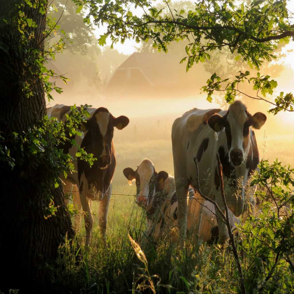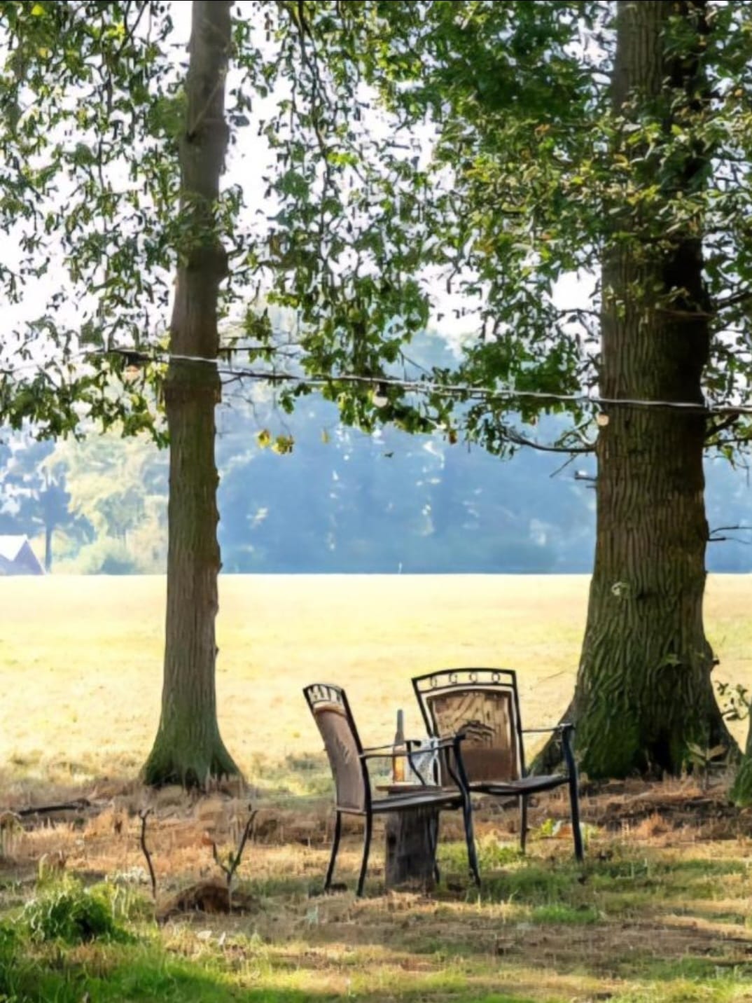 De wagen staat onder een dak van oude bomen, met je voeten bijna in het weiland waar zomers onze eigen koeien grazen en herkauwen.
