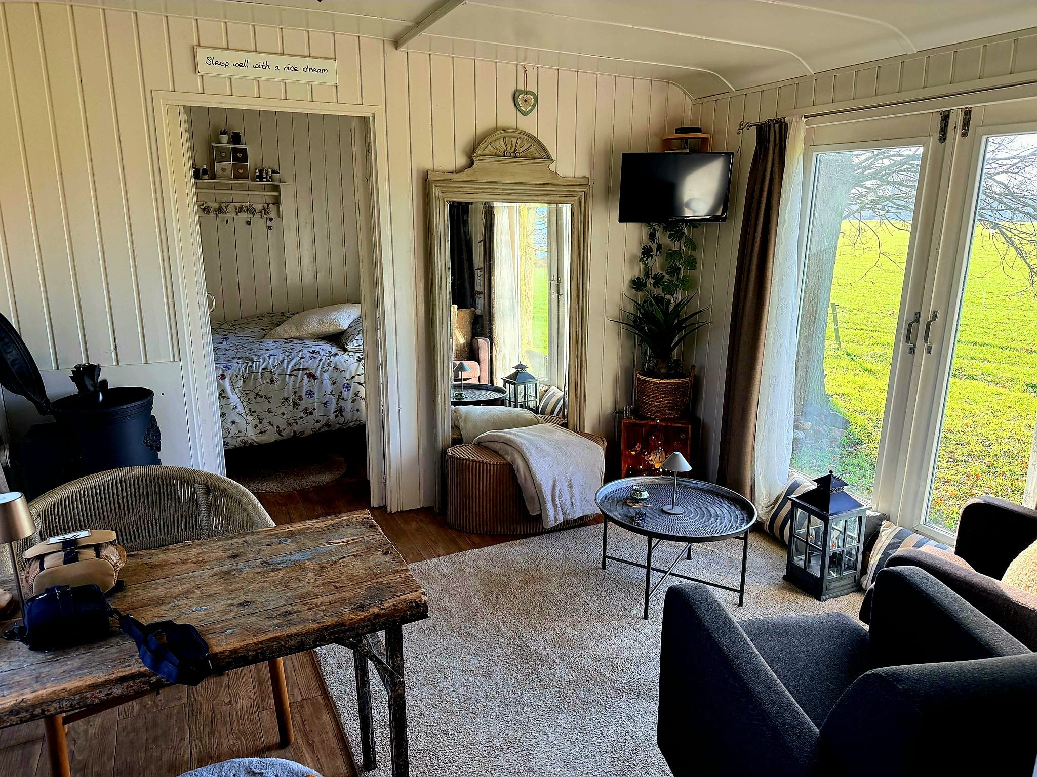 Door de uitbouw is het zitgedeelte verrassend ruim en overal waar je kijkt, komt het buitenleven door de ramen naar binnen. Er is ook een televisie aanwezig.