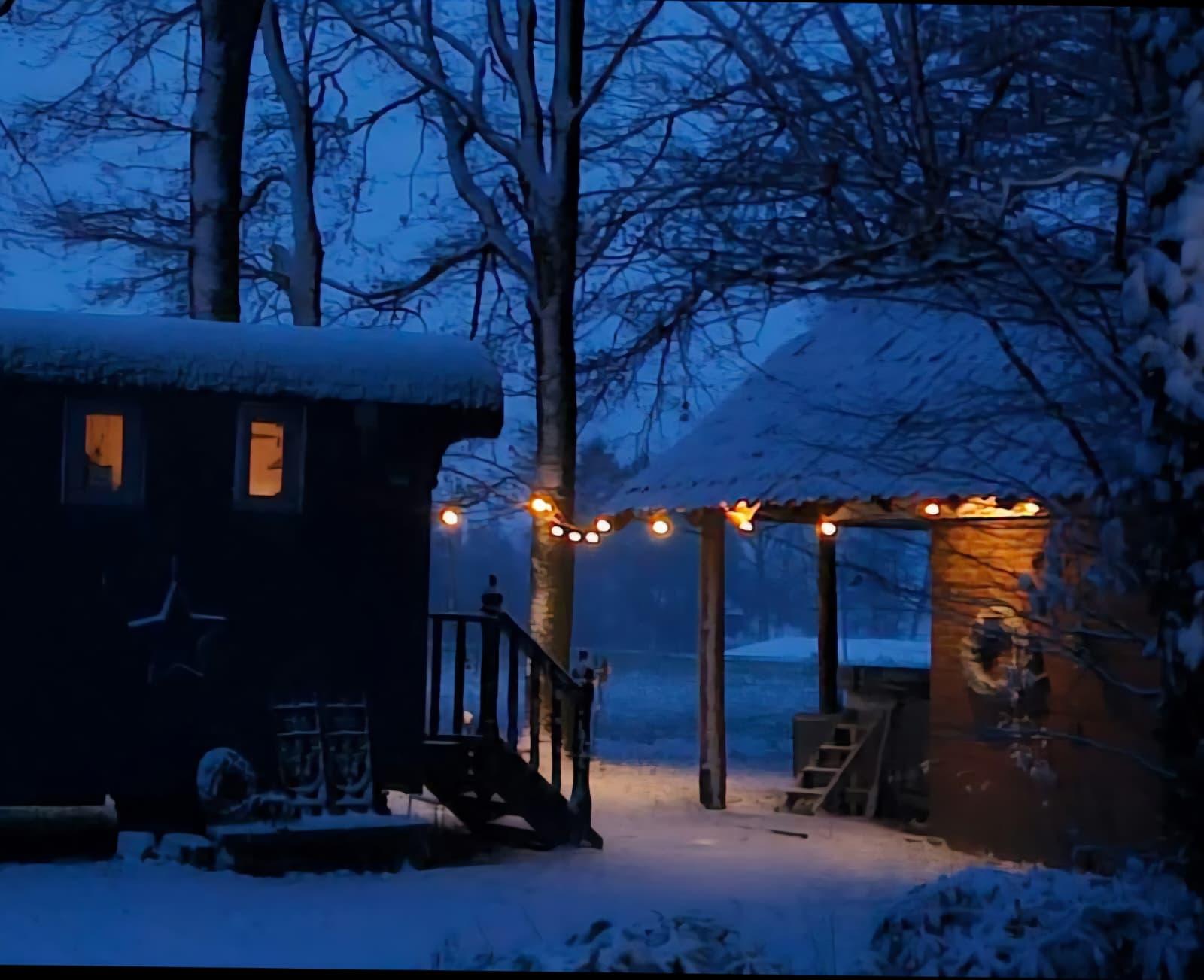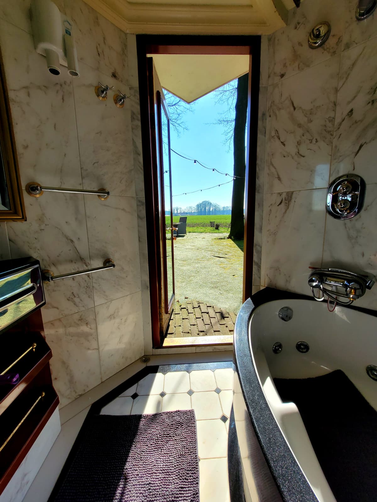 Vlak naast de wagen staat het Bathhouse met douche, wastafel en verwarming en het toilet